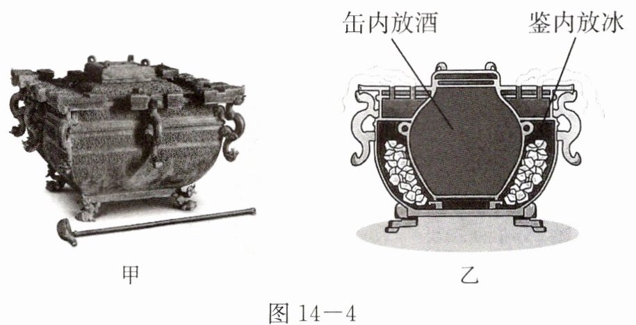 1. 图 14−4 甲为我国国家博物馆展出的青铜冰鉴,堪称世界上最早的冰箱。青铜冰鉴分为两层,外层为鉴,内层为缶,盛夏之时,鉴内放冰,缶内放酒,如图 14−4 乙所示。下列说法正确的是(