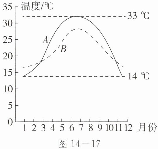 4. 某一沿海城市和某一内陆城市年气温变化曲线如图 14−17 所示。下列说法正确的是(