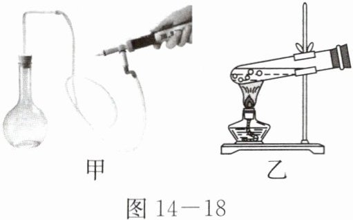 13. 小明利用如图 14−18 甲、乙所示的装置探究改变物体的内能和热机工作原理的两个演示实验。关于这两个实验的操作和现象的说法不正确的是(