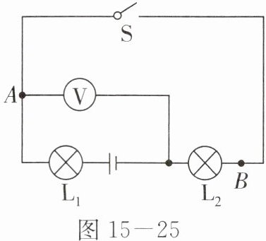 6. 如图15-25所示的电路中,当开关S闭合后,电压表的示数表示(