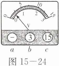4. 李明同学在一次实验中,用有3V和15V两个量程的电压表测电压时,电压表的“-”接线柱已接入电路。在用15V量程试触时,指针位置如图15-24所示。下一步的实验操作应该是(
