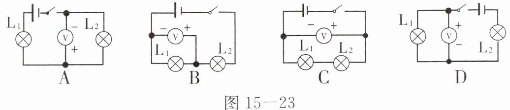 3. 如图15-23所示,闭合开关后能测出小灯泡L₁两端的电压的电路是(