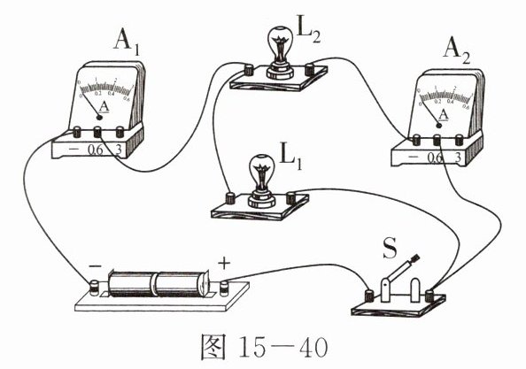 4. 在探究串、并联电路中电流的规律时,做了如图15-40所示的实验。闭合开关后,电流表A₁、A₂的示数分别为0.5A和0.3A,通过小灯泡L₁的电流为