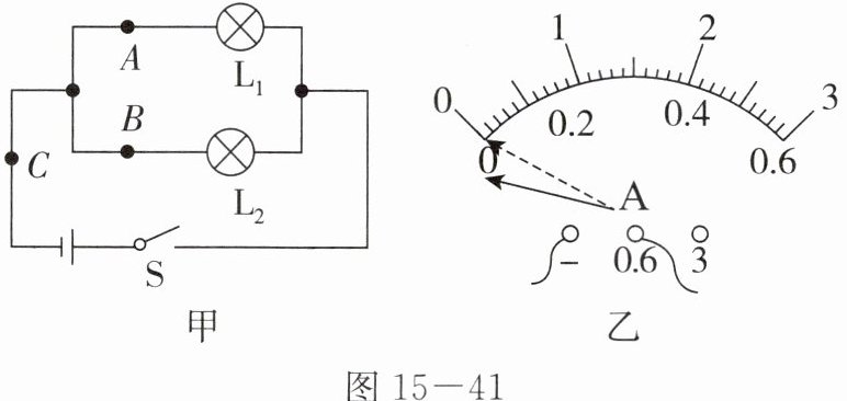 5. 在“探究并联电路电流特点”的实验中,小文和小强两位同学一起合作进行实验,按如图15-41甲所示的实验电路图进行实验。