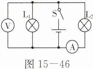 6. 如图 15−46 所示电路,电源电压不变,闭合开关 $ S $,两灯均发光。一段时间后,一盏灯突然熄灭,而电流表和电压表的示数都不变。出现这一现象的原因可能是(