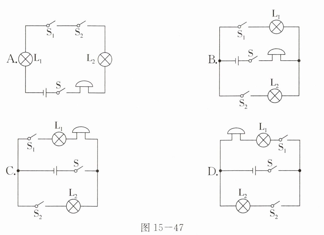 7. 某电动车上装有转向灯和蜂鸣器,启动电动车后(相当于闭合开关 $ S $),开关拨至“左”时(相当于闭合开关 $ S_1 $),左转向灯 $ L_1 $ 亮同时蜂鸣器响;开关拨至“右”时(相当于闭合开关 $ S_2 $),右转向灯 $ L_2 $ 亮同时蜂鸣器响。图 15−47 电路设计中最合理且符合实际的是(