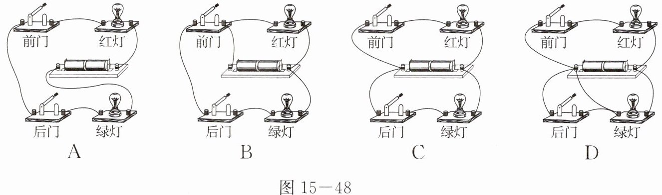 8. 小雨学校的前、后两个门各装一个开关,传达室内有红、绿两盏灯和电池组,若前门来人闭合开关时红灯亮,后门来人闭合开关时绿灯亮,图 15−48 中的电路符合要求的是(