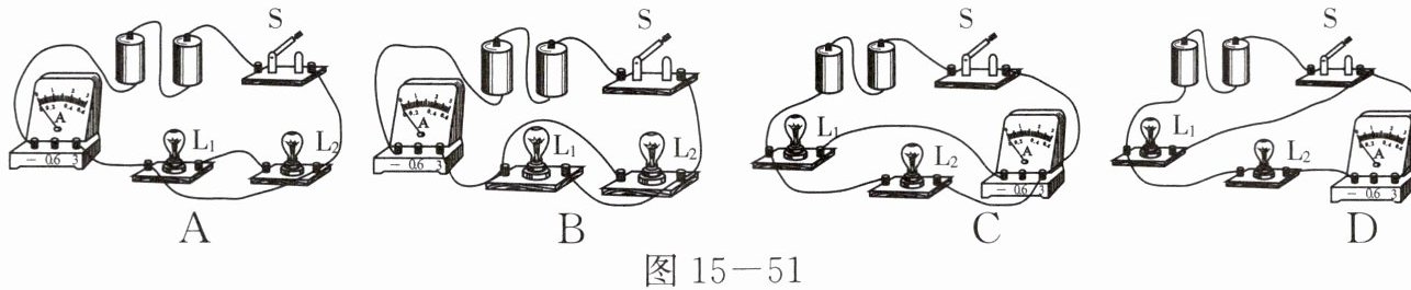11. 如图 15−51 所示的四个电路中,电流表能测量通过 $ L_1 $ 电流的是(