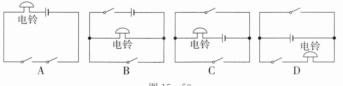 10. 公交车后门左右扶杆上各装有一个相当于开关的按钮。当乘客按下任一按钮时,铃声响起,提醒司机有人要下车。图 15−50 中符合要求的电路是(