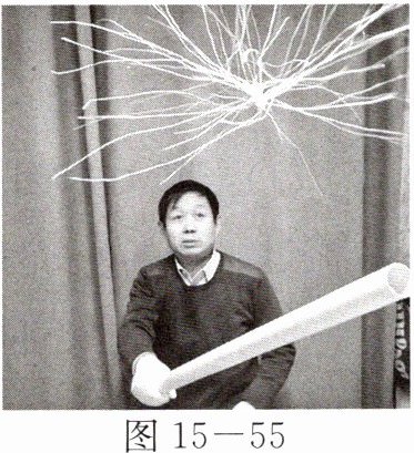 15. (多选)物理课上老师给同学们演示了一个实验:老师将塑料袋剪成细丝,用两块毛皮分别来回摩擦细丝和塑料管后,将细丝抛向空中,在其下方用塑料管靠近时,细丝可以在空中飞舞,如图 15−55 所示。下列说法正确的是(