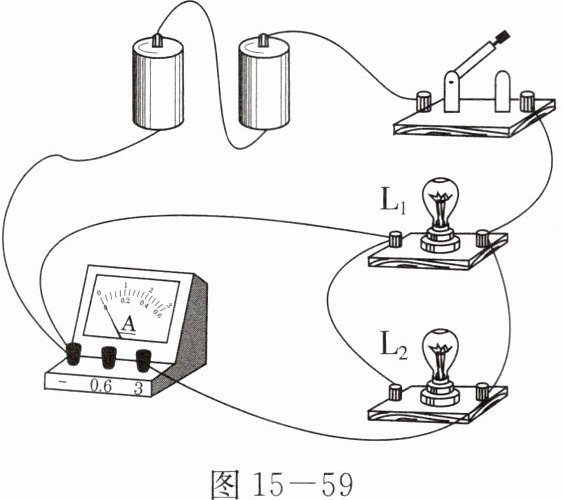 23. 在“用电流表研究并联电路中电流关系”的实验中,小明同学测得干路中电流为 $ 0.5 \, A $,通过灯 $ L_1 $ 的电流是 $ 0.2 \, A $。现要测出通过灯 $ L_2 $ 的电流,由同组的小张同学负责改接电路,小张改接后的电路如图 15−59 所示。