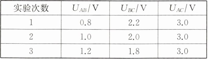 (3)用电压表分别测出 $ A $ 与 $ B $、$ B $ 与 $ C $、$ A $ 与 $ C $ 两点间的电压为 $ U_{AB} $、$ U_{BC} $、$ U_{AC} $。经过多次实验,得到的数据记录在下表中。分析实验数据,可得串联电路的电压特点是