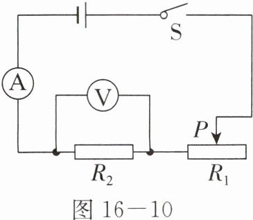 2. 如图 16 - 10 所示,电源电压 4.5 V 保持不变,电压表选择“0~3 V”量程,电流表选择“0~0.6 A”量程,电阻 $ R_2 $ 阻值为 10 Ω,滑动变阻器 $ R_1 $ 规格为“20 Ω 1 A”,闭合开关 S,移动滑片 P 的过程中,电路中的最大电流为