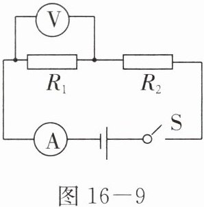 8. 在图 16 - 9 电路中,电源电压为 6 V,$ R_1 = 4 \Omega $,闭合开关 S 后,电压表读数为 2 V。求: