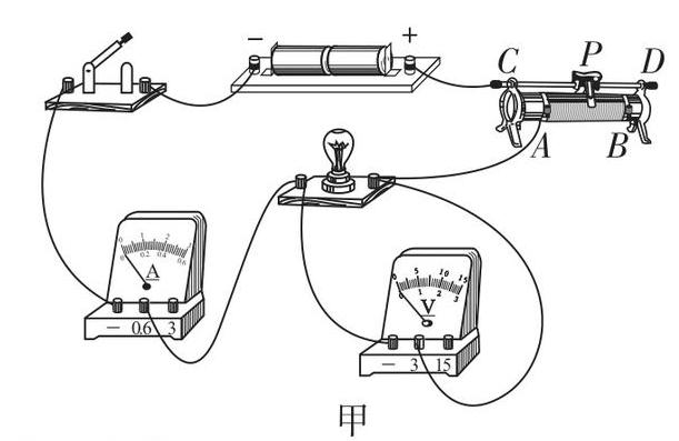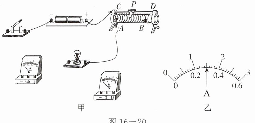 1. 图 16 - 20 中的甲图是小明同学在“测量小灯泡电阻”的实验中所连接的实物图,灯泡的额定电压是 $ 2.5 V $,电阻约为 $ 9 \Omega $。