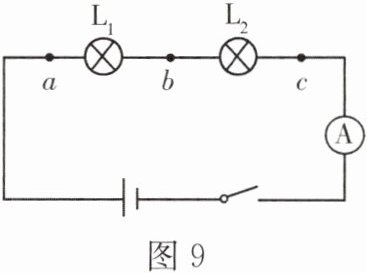 14. 如图 9 所示电路中,闭合开关后发现$L_1$和$L_2$均不发光,电流表无示数。为了找出故障原因,小华用电压表进行检测,发现$a$、$b$间电压为$0$,$a$、$c$间电压为$3V$,$b$、$c$间电压为$3V$。则电路故障可能是(