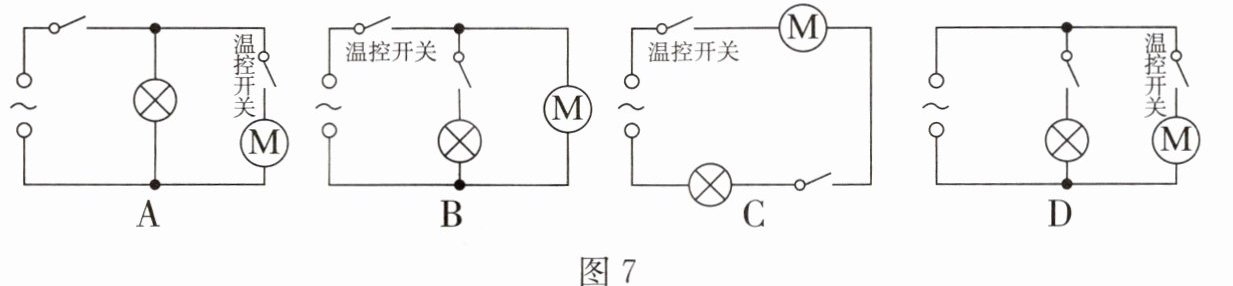 12. 电冰箱的压缩机(电动机)是由温控开关控制的,冷藏室中的照明灯是由冰箱门控制的(开门灯亮、关门灯灭)。在如图 7 所示的电路中,符合上述特点的是(