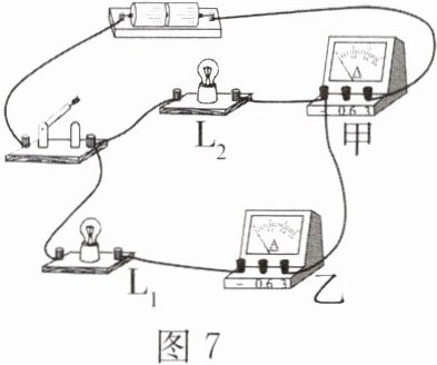 14. 图7所示的实物电路中,当开关闭合时,甲电流表的示数为0.5A,乙电流表的示数为0.2A。下列判断正确的是(