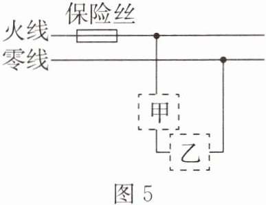 12. 某家庭电路的部分电路如图5所示,其中甲、乙两处分别装用电器和开关。对此电路,下列说法正确的是(