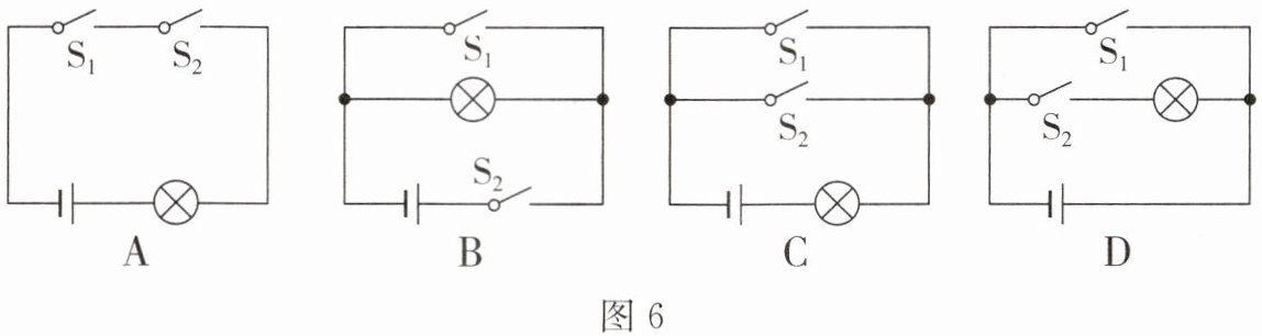 13. 校园有前后两道门,为了加强校内安全,学校给值班室安上了指示灯,只有当两道门都关上时(关上一道门相当于闭合一个开关),值班室内的指示灯才会发光。如图6所示,电路中符合要求的是(