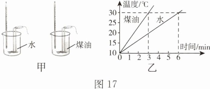 29. 如图17甲所示是“比较水和煤油吸热能力”的实验装置,用相同的“热得快”同时加热水和煤油,温度随时间变化图像如图17乙所示。