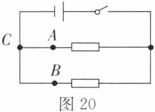 32. 为探究并联电路中电流的关系,某同学按如图20所示连接电路;把电流表分别接入到电路中的A、B、C处,测出它们的电流,填入下表。为了防止个别偶然因素的影响,我们可以采用以下两种方法之一,重复上面实验步骤。
