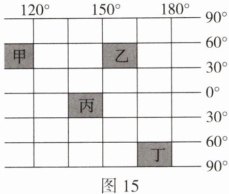 读图 15 经纬网图,完成 3—4 题。