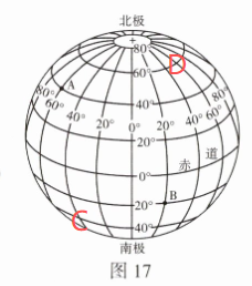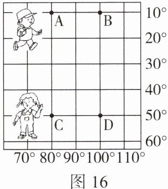 5. 如图 16 所示,小明从 A 地沿纬线走到 B 地,同时小红沿纬线由 C 地走到 D 地,仔细思考判断,他们分别跨越了多少经度?所走的路程是否相等?为什么?
