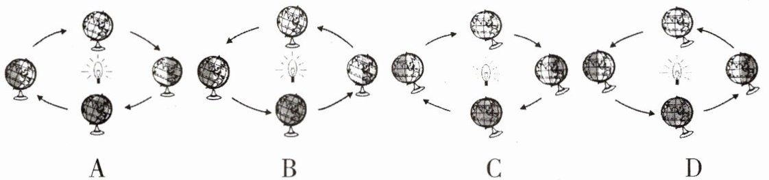6. 将一盏电灯放在桌子上代表太阳,用一个地球仪代表地球,小明同学拿着地球仪围绕电灯转一周演示地球的公转(箭头代表公转的方向)。正确的演示图是(