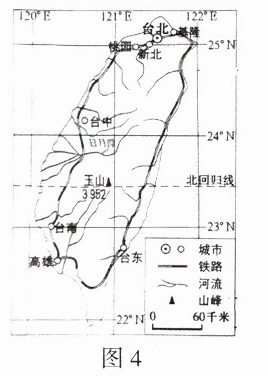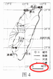 (2) 在图4中圈出台湾岛地图的比例尺。此种表达方式被称为____,转化为数字形式为____。
