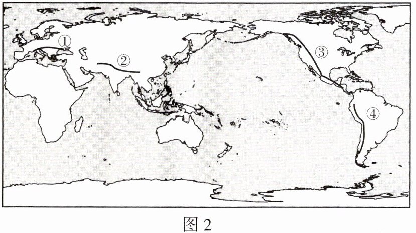2. 读图 2 世界主要山脉分布图,喜马拉雅山脉是图中数字(
