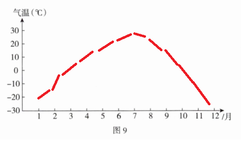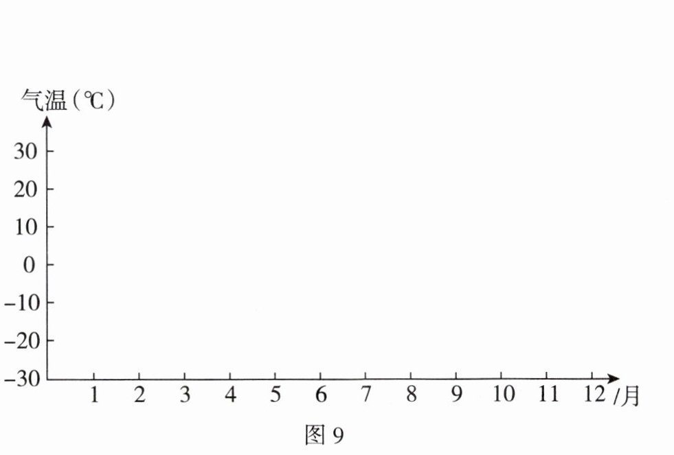 下表示意某地各月平均气温,根据表中的气温数据绘制一幅气温曲线图(图9)。