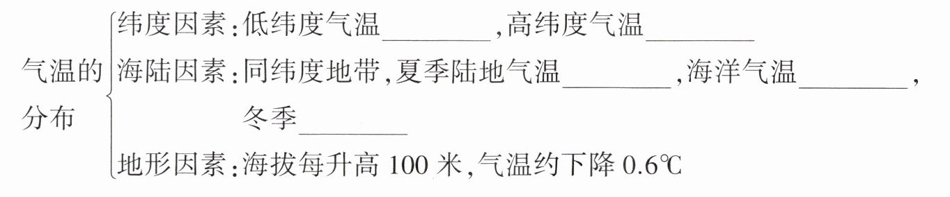 同纬度地带,夏季陆地气温$高$,海洋气温$低$,冬季$陆地气温低,海洋气温高$。
