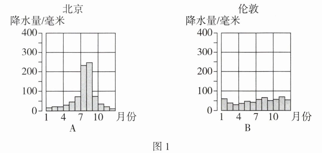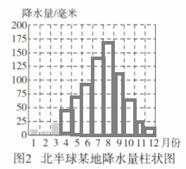 图来表示。图1中A、B两地,降水量季节分配比较均匀的是B