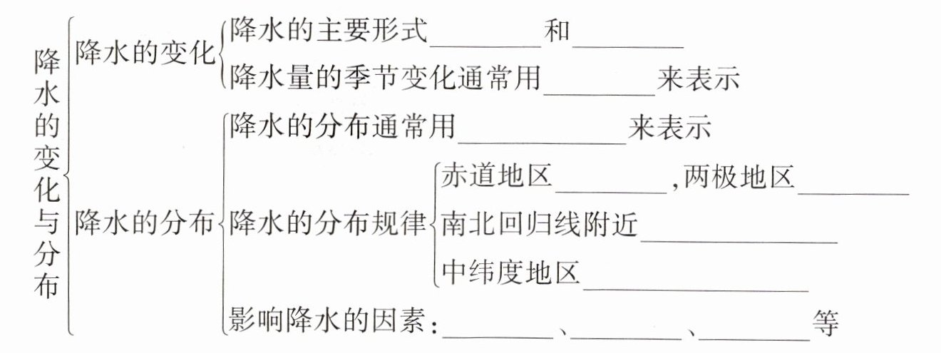 降雨;降雪;降水量柱状图;等降水量线图;降水多;降水少;大陆东岸降水多,西岸降水少;沿海地区降水多,内陆地区降水少;纬度位置;海陆位置;地形