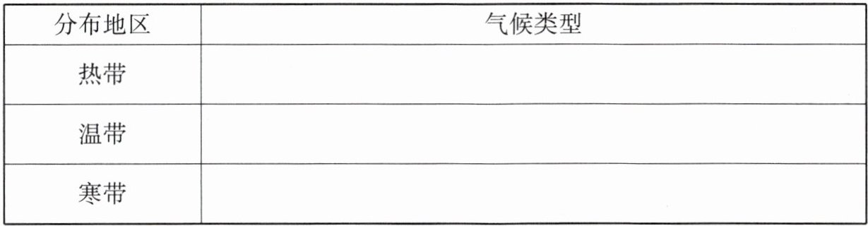 (5) 读教材图4.24,找出主要分布在热带、温带和寒带的气候类型。