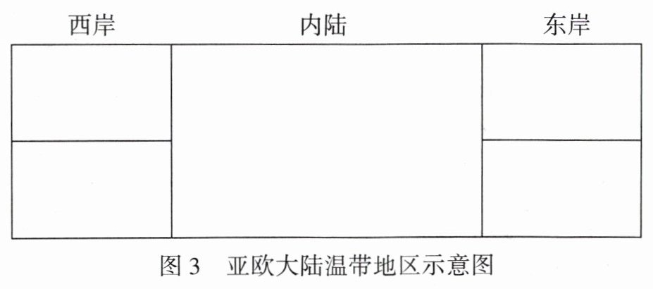 (6) 根据下列图示,找出分布在温带地区亚欧大陆东岸、内部、西岸的气候类型,并填写在图中。