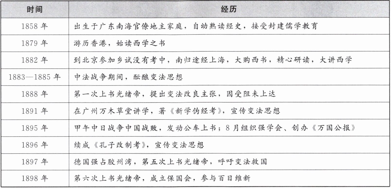 (1)因素:家庭环境;社会环境(民族危机、救亡图存);游学经历(西学传播、文化背景)。(2)努力:宣传变法(著书立说;创办报刊;组织学会;兴办学堂);多次上书;参与百日维新。(3)经历:第一阶段,从学习儒学到学习西学。第二阶段,宣传变法思想,参与变法活动。关系:个人发展与时代变化紧密相连,时代变化深刻影响着个人发展,个人发展要顺应时代发展潮流。