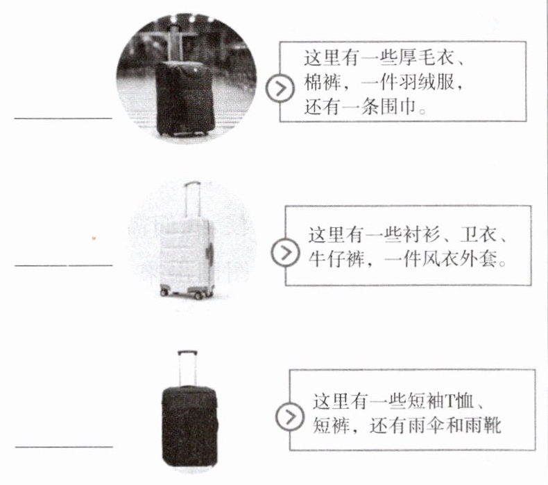 ②第一个行李箱(厚毛衣、棉裤、羽绒服、围巾):目的地为乌兰巴托;第二个行李箱(衬衫、卫衣、牛仔裤、风衣外套):目的地为北京;第三个行李箱(短袖T恤、短裤、雨伞、雨靴):目的地为雅加达。