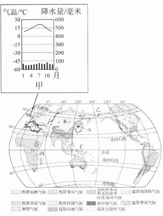 枣庄某中学地理兴趣小组的同学通过网络方式,分三组查阅相关资料,开展了一次以“世界主要气候类型”为主题的线上探究学习。读世界气候类型分布图及甲地气候资料图,完成下列要求。