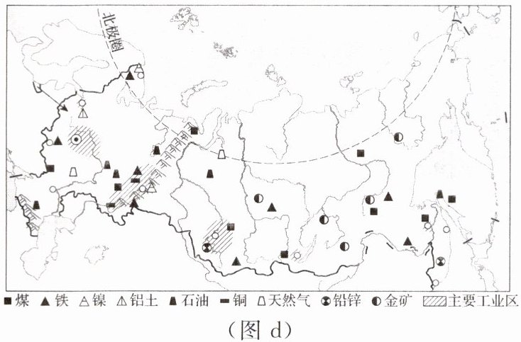 阅读俄罗斯人口密度示意图(图 a)、地形图(图 b)、气候类型分布图(图 c)及交通资源分布图(图 d),探究影响俄罗斯人口空间分布的自然和社会经济因素分别有哪些。