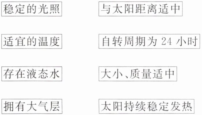 稳定的光照——太阳持续稳定发热;适宜的温度——与太阳距离适中 、自转周期为24小时;存在液态水——与太阳距离适中;拥有大气层——大小、质量适中。 (按题目连线形式对应填写)即稳定的光照连太阳持续稳定发热;适宜的温度连与太阳距离适中、自转周期为24小时;存在液态水连与太阳距离适中;拥有大气层连大小、质量适中。