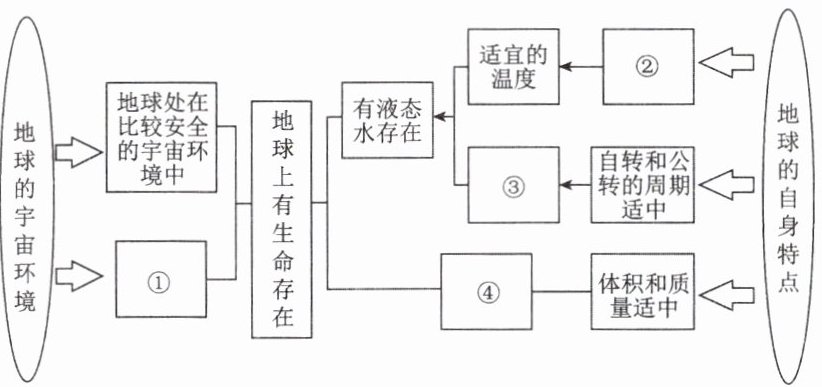 5. 分析地球是太阳系中唯一存在高级智慧生命的天体的原因,将下列字母填在对应数字后的横线上,完成逻辑框图。