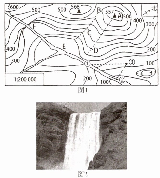 21. 某中学地理研学小组到我国东南沿海某区域进行实地研学。研学小组甲队学员从①点到F点,沿河流进行考察,乙队学员大致沿虚线C到达B处,丙队学员大致沿虚线D到达A进行考察。下面两幅图分别示意该地等高线地形图及瀑布景观图。读图,完成下列要求。