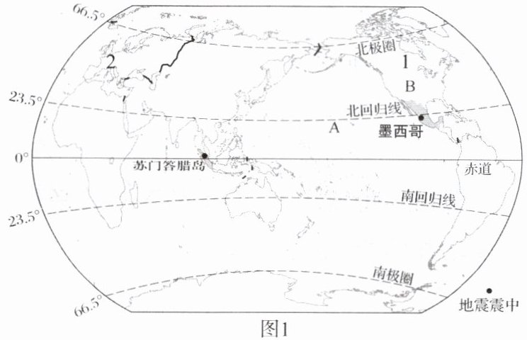 山脉的一部分。(3)墨西哥和印度尼西亚都是位于火山地震带上的国家,地震灾害频发。结合图 1、图 2 可知,印度尼西亚苏门答腊岛所在的火山地震带是