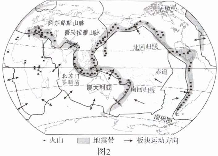 。(4)火山地震大多是由板块运动引起的,请你结合图 1、图 2,说出印度尼西亚苏门答腊岛地震是哪两大板块相互碰撞挤压形成的。