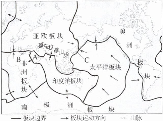 板块交界处,在不断缩小。(5)他们还发现 C 国地震频发,人们平均每天约能感受到 4 次地震,这是因为该国位于
