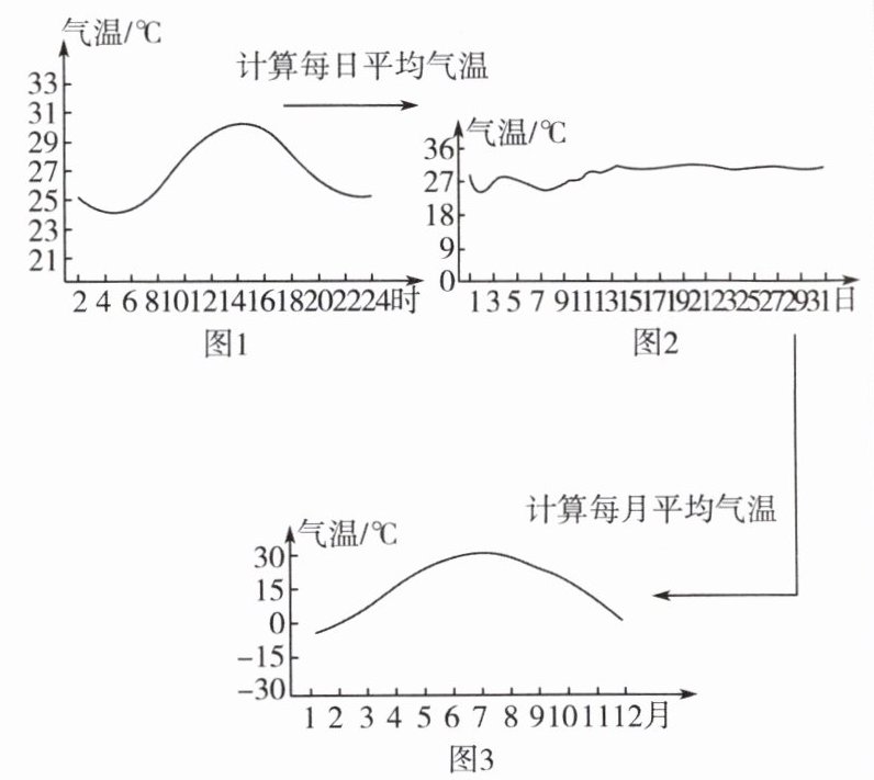 ℃。探究第三步:计算日平均气温和月平均气温,绘制气温月变化示意图(图2)和气温年变化示意图(图3)。