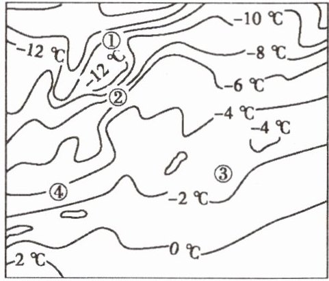 4. 若图示区域气温只受地形影响,则①②③④四地中海拔最高的是(