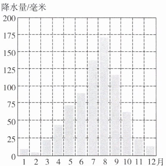 家住枣庄的小英8月份到某海边游玩,发现在她游玩的这段时间内流入海洋的河流含沙量特别大,海面呈现黄蓝交汇的景观,4个月后她再次来到此地时海面仅呈现蓝色。下图为当地降水量柱状图。读图,完成(1)~(2)题。